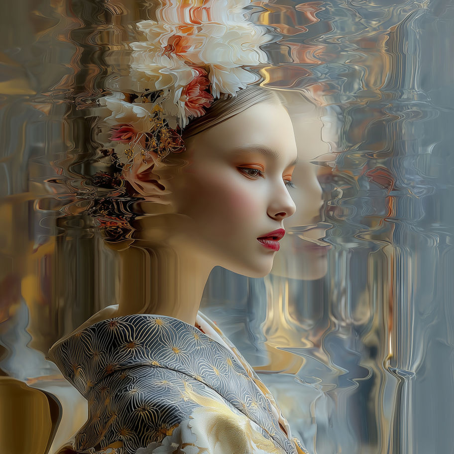 Wearing a softly patterned kimono, she appears beside her own reflection. Her presence flickers between reality and memory, calm yet ever-shifting.