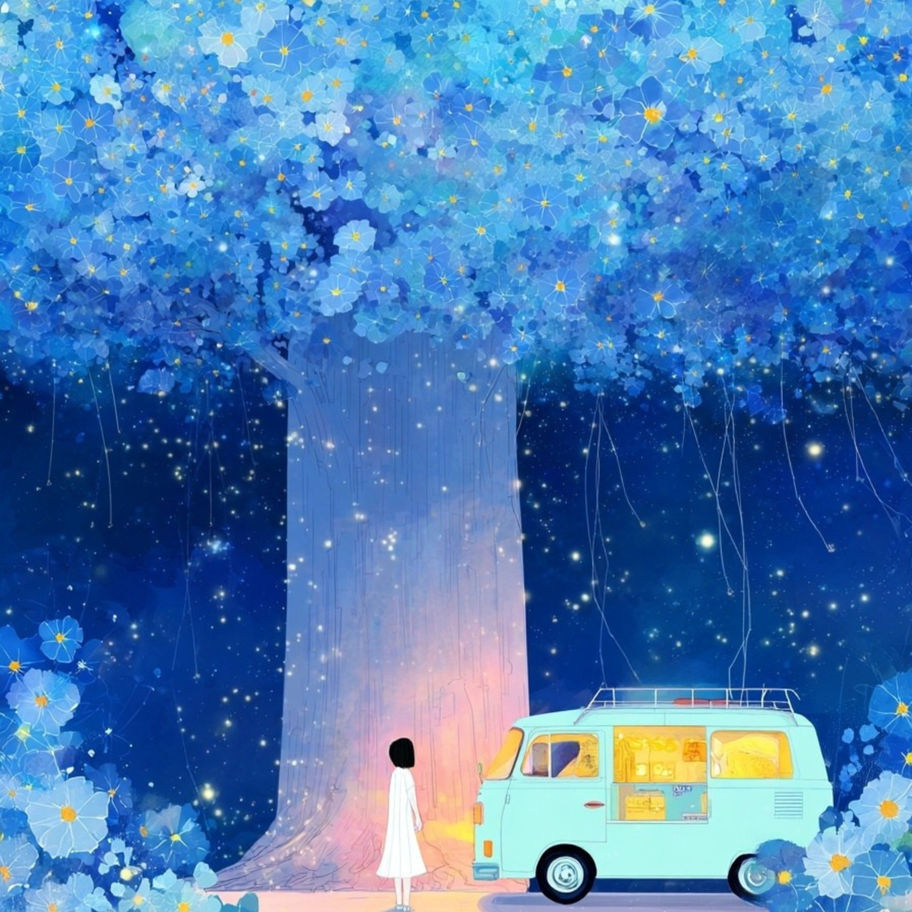 "A magical tree adorned with blue flowers gathered from around the world. When night falls, these blossoms transform into stars, ascending to the heavens to grant the wishes of all who dream beneath it.