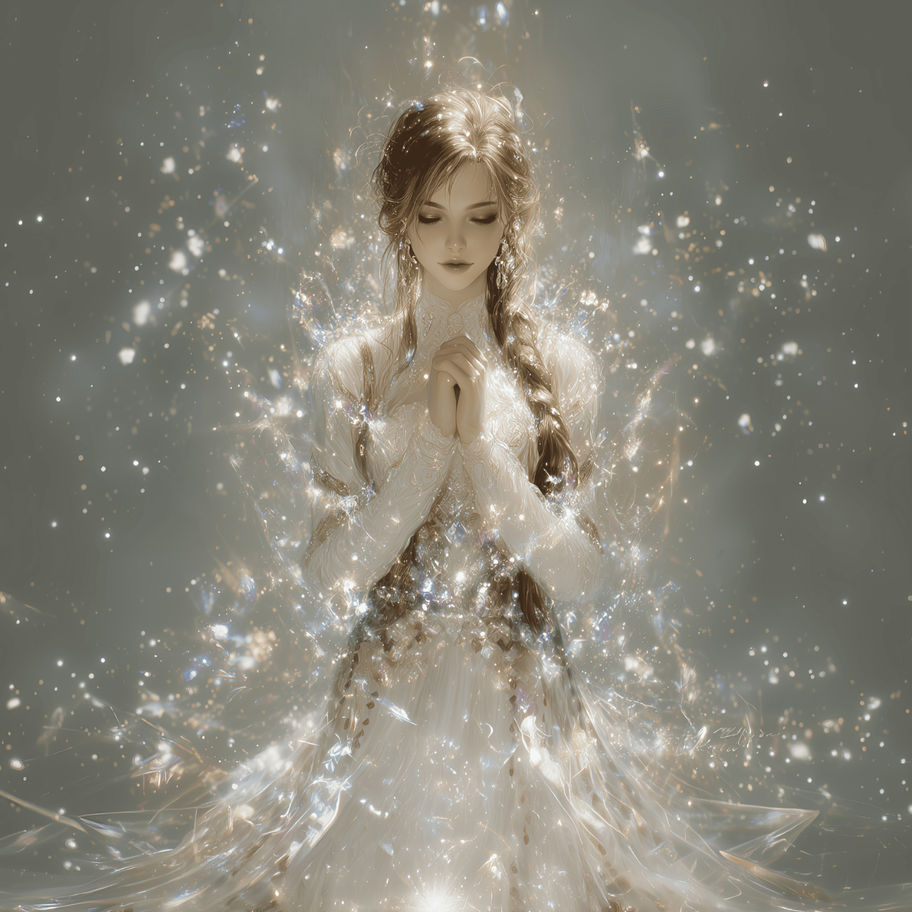 Delicate particles of light gently weave around the woman, embracing her in warmth and serenity. This work expresses the quiet hope and peace that dwell